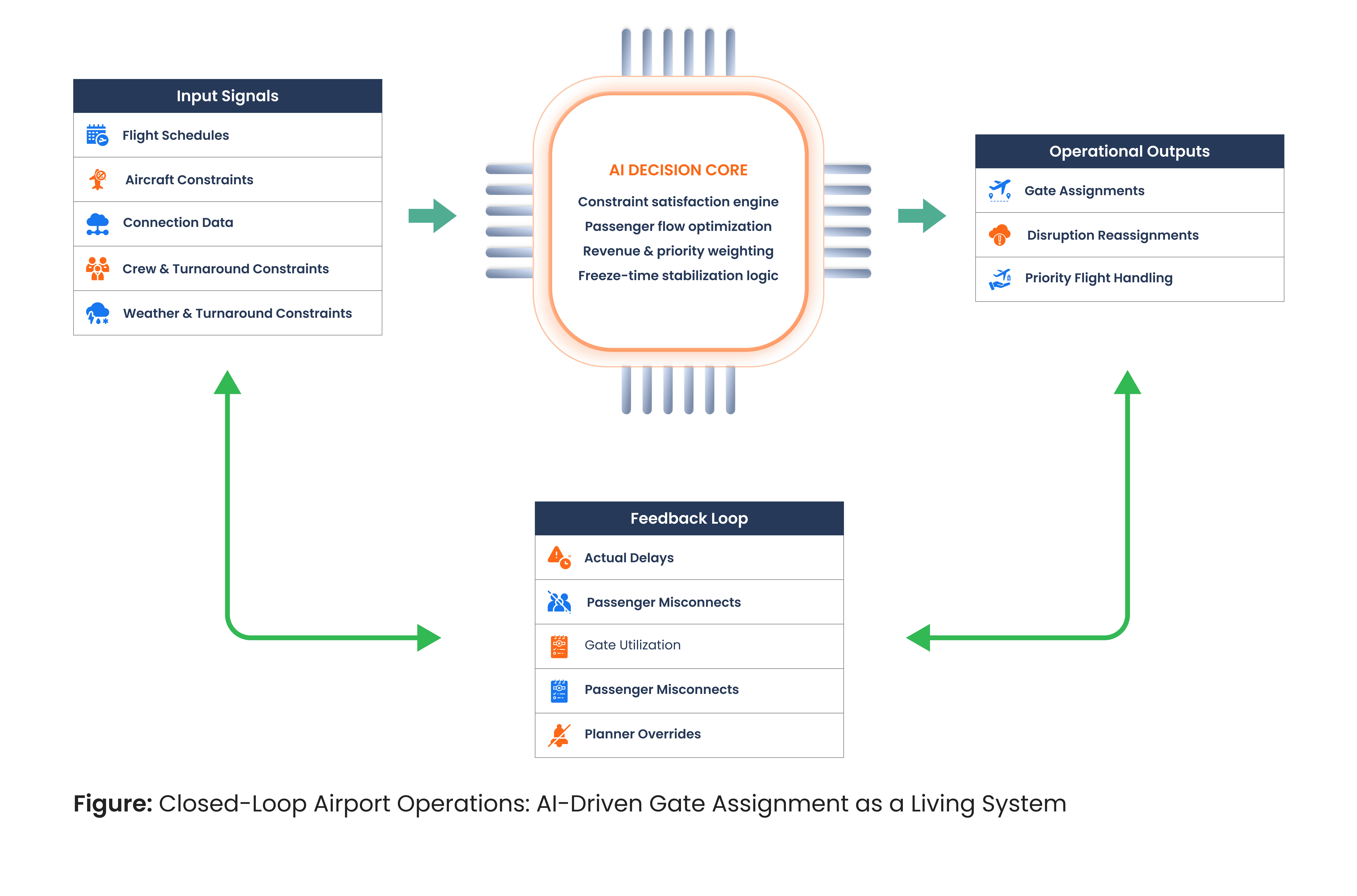 The solution integrates directly with airport operational databases, flight information systems, and airline scheduling platforms, creating a closed loop where plans are continuously informed by real-world outcomes.